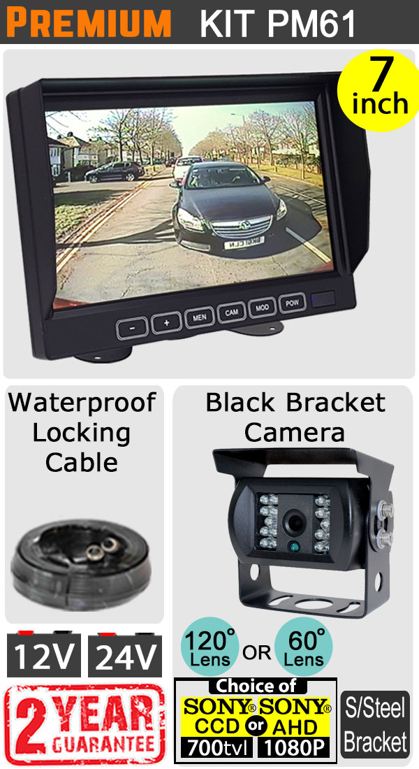 7" Slimline Monitor + Black (Sony CCD or Sony AHD) bracket (reversing or rear view) Camera Kit | PM61