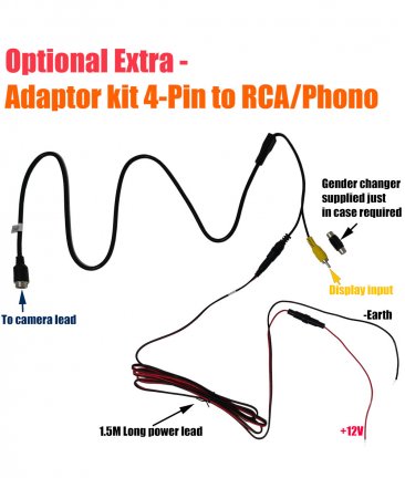 The camera is fitted with a 4 pin plug on the end, but if you are installing on to a phono based screen then you can add an adaptor set in the options.