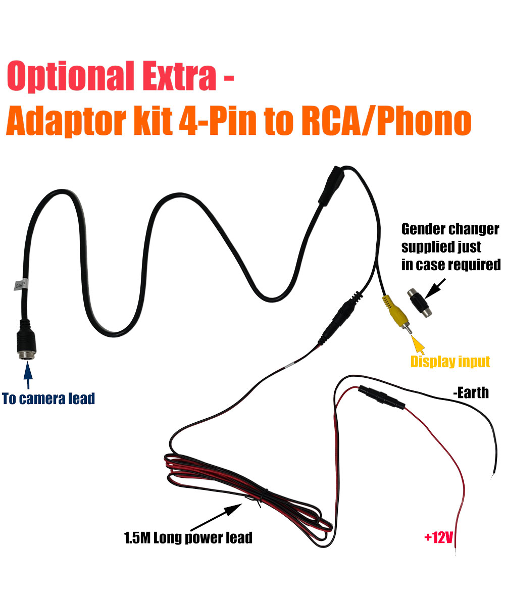 This camera is supplied with approx 1ft fly lead with a 4-pin aviation connector at the end. We prefer the 4-pin version because it means a monitor can provide power to the camera, and this avoids CANBUS issues that can occur if taking power from the reverse light. If you did wish to use a phono/RCA monitor instead then we recommend sticking with the 4-pin cable and using an adaptor kit at the front (see the photo/option for more details) this means you can send power from the front of the vehicle to the camera down the 4-pin cable.