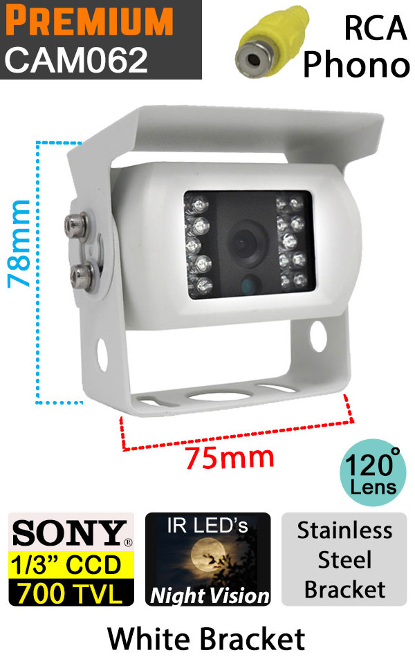 An RCA Phono connector bracket camera that gives you everything you could ask for. Painted matt white, uses a stainless steel bracket to prevent rusting. Fitted with a very high spec Sony 811 1/3" Sony CCD 700TVL image sensor. Night Vision IR LED's and a quality lens giving 120 degrees wide angle viewing.