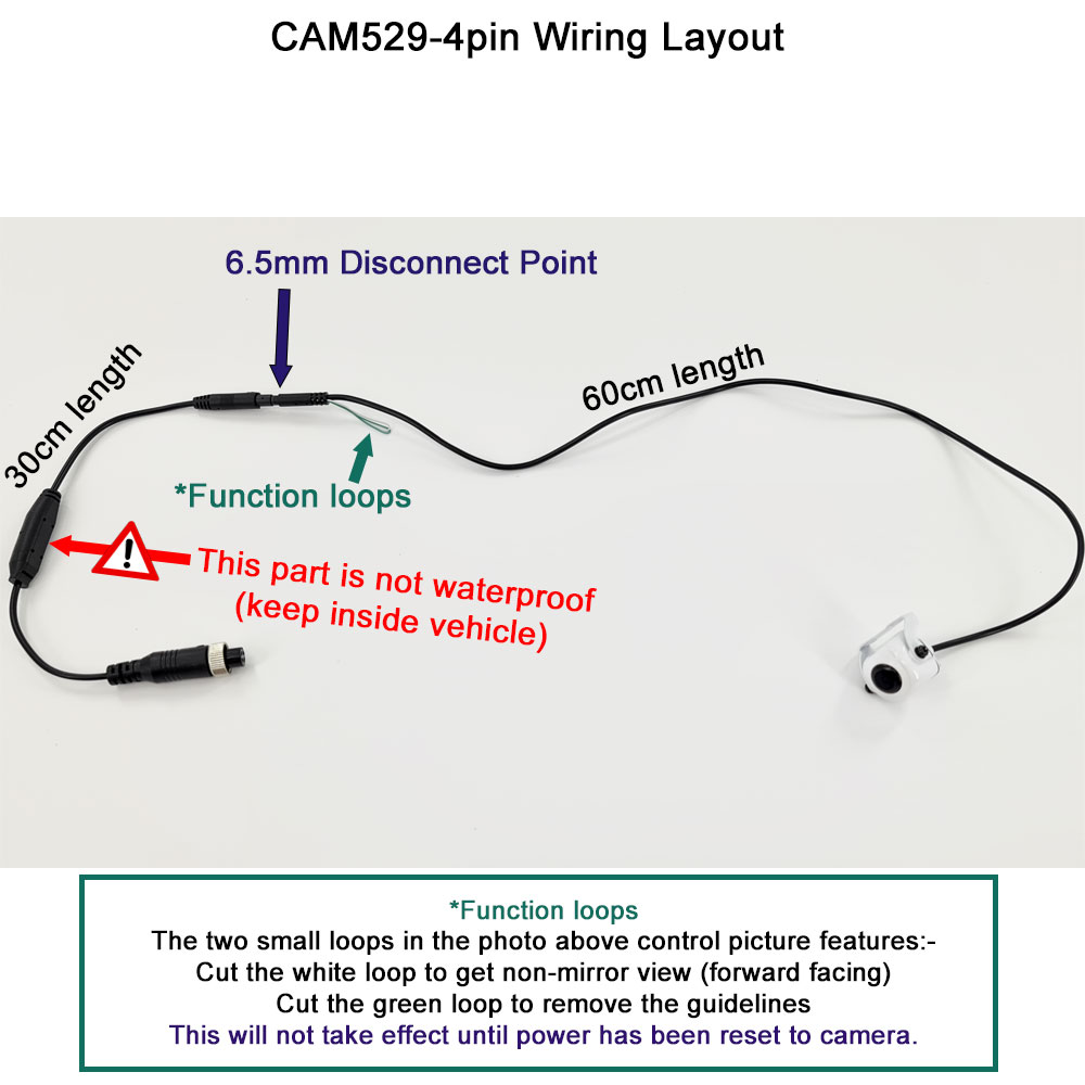 The camera has the 4 pin screw connector plug on its fly lead, to allow it to work with monitors that provide power to the camera down an all in one cable. Please note that the camera has a small non-waterproof plug in-line approx 60cm back from the camera. This must be in a dry, protected environment to avoid premature failure eg inside a tailgate.