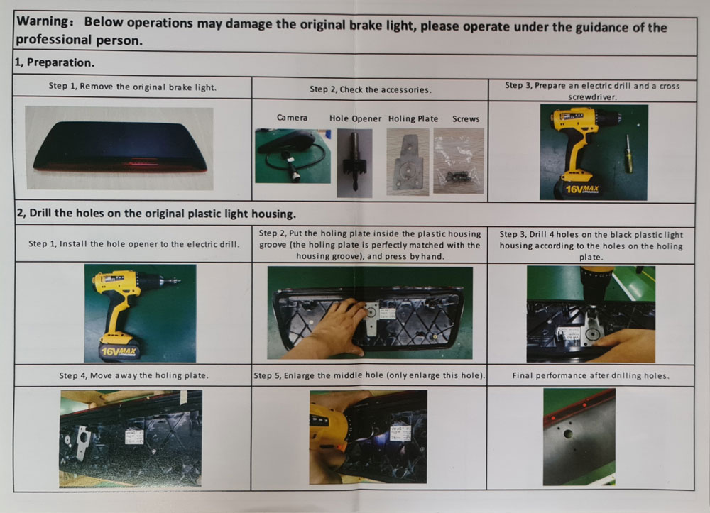 This camera is supplied with the bracket, gasket, hole saw, instructions and parts required to add the camera to the top of your existing brake light. We stock various alternative mounts for this type of monitor including quick release, suction (for temporary fixing), and ceiling-mounted (see Monitor Brackets).