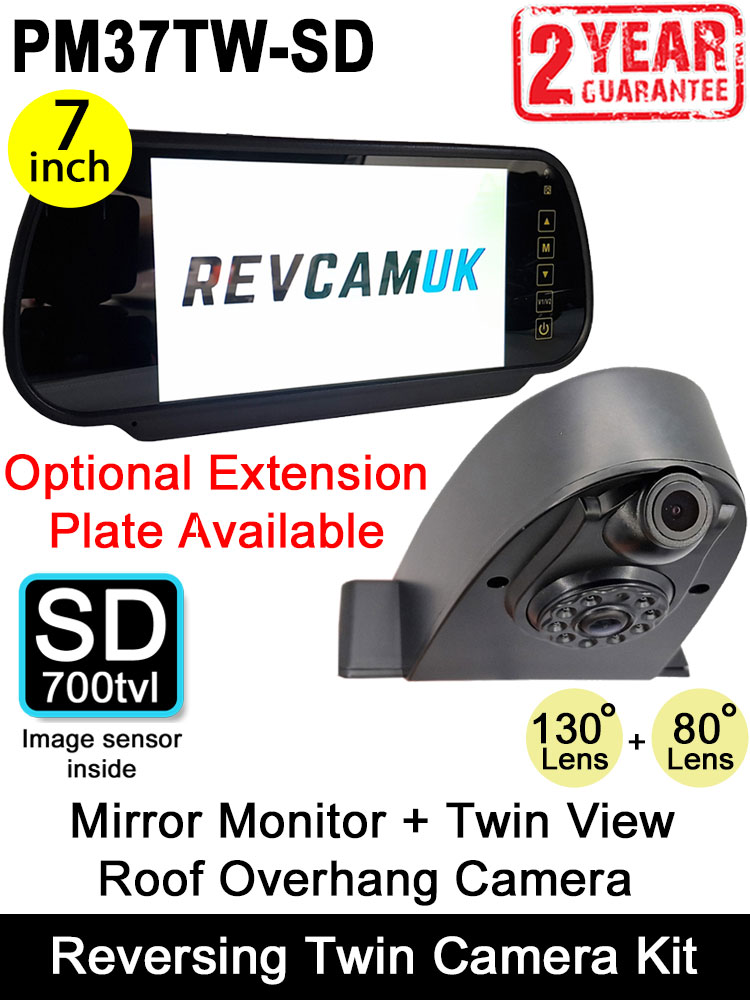 7" Mirror Monitor and Roof Overhang Reversing + Rear View Twin Lens Camera Kit | PM37TW-SD