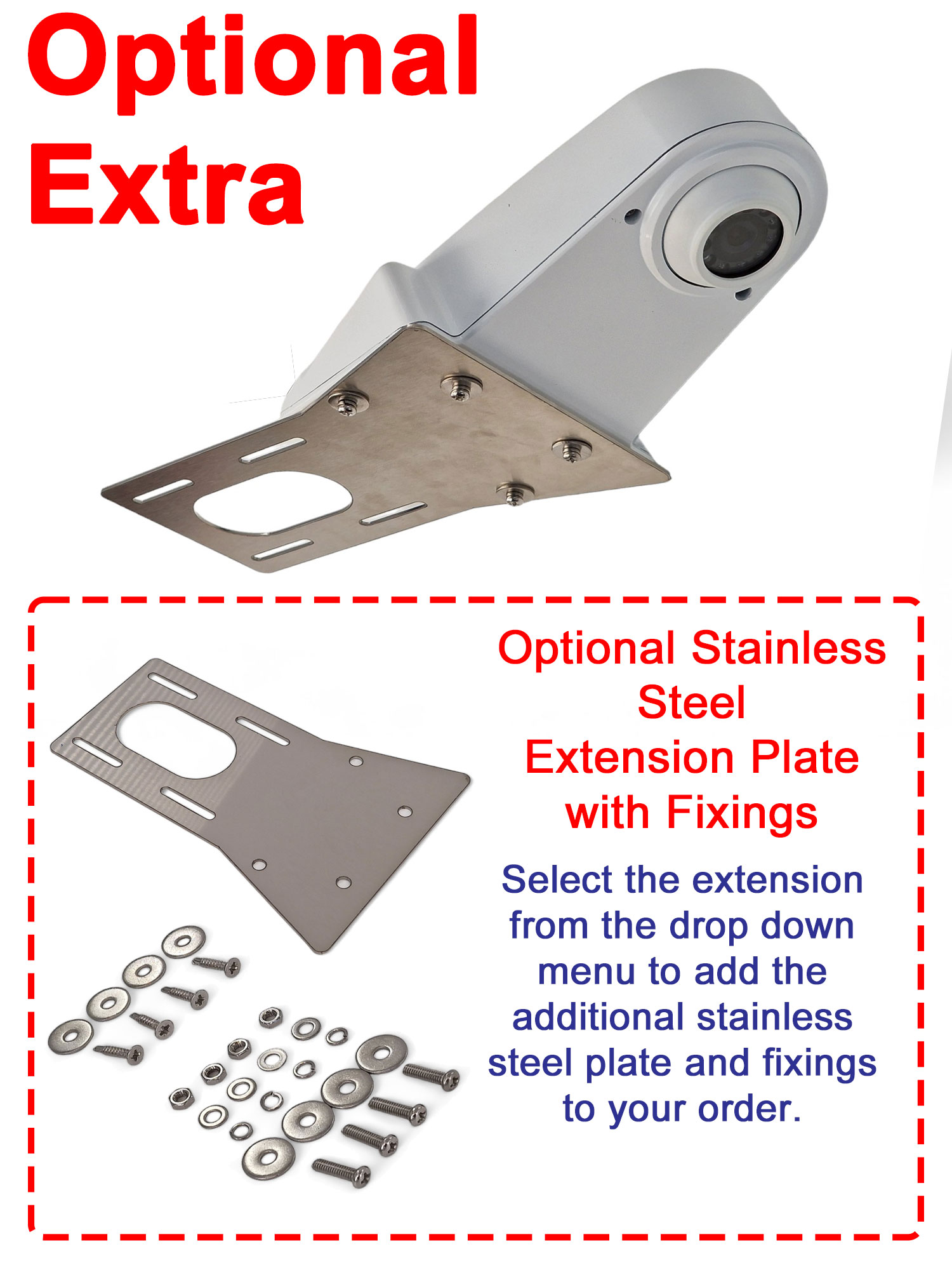 Optional stainless steel extension plate to extend camera: