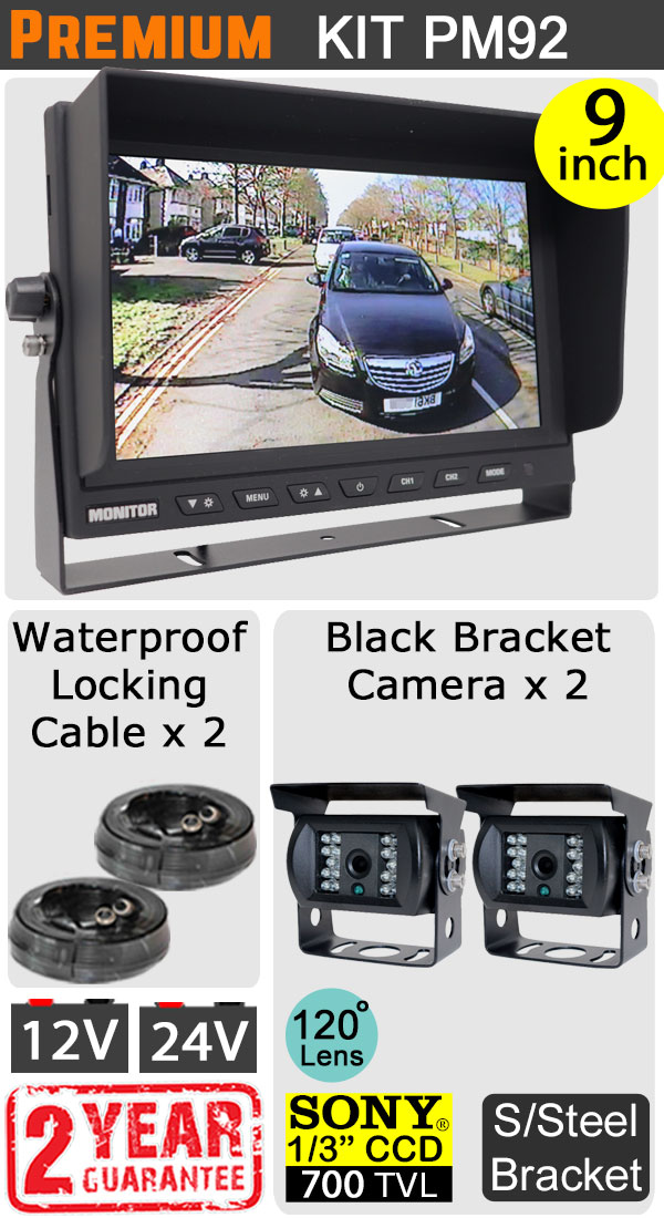 PM92 - Kit with 9" heavy-duty dash monitor + 2x cables + 2x black Sony CCD bracket reversing/general use camera