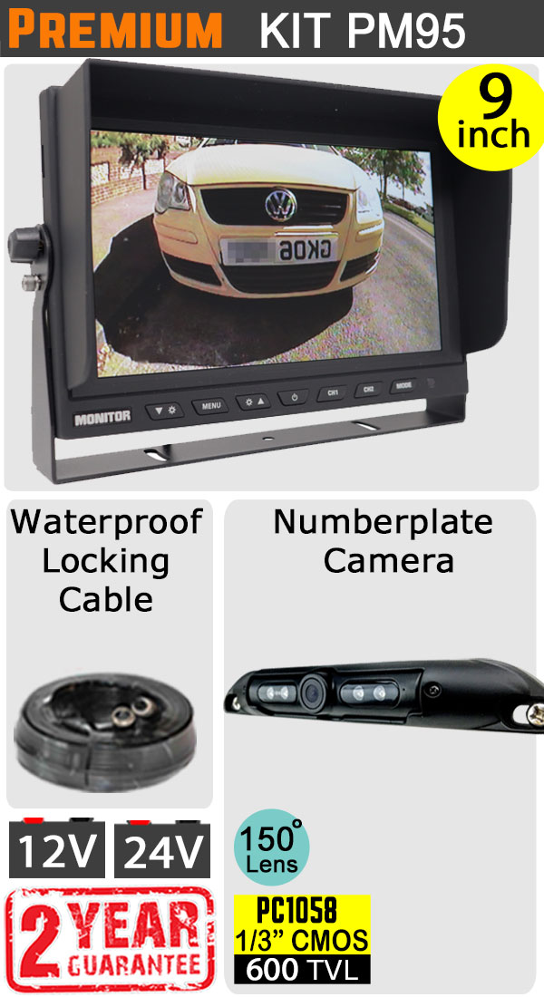 PM95 - Kit with 9" heavy-duty dash monitor + cable + hi-res numberplate reversing camera