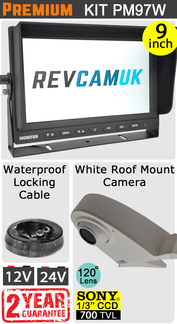 PM97W - Kit with 9" heavy-duty dash monitor + cable + Sony CCD white roof/sharkfin reversing camera