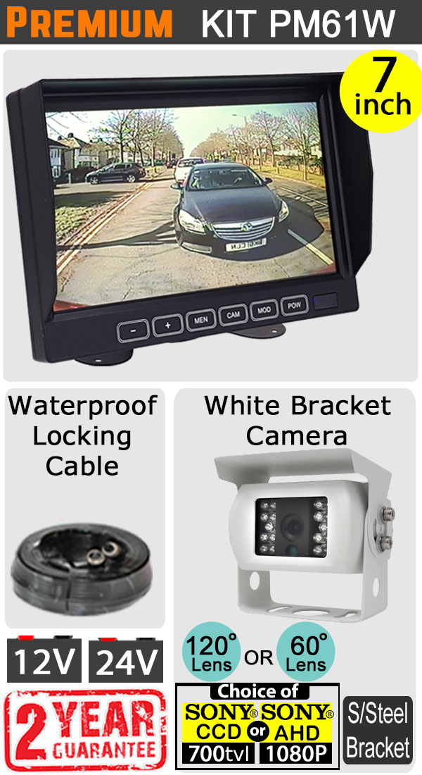 7" Slimline Monitor + White (Sony CCD or Sony AHD) bracket (reversing or rear view) Camera Kit | PM61W