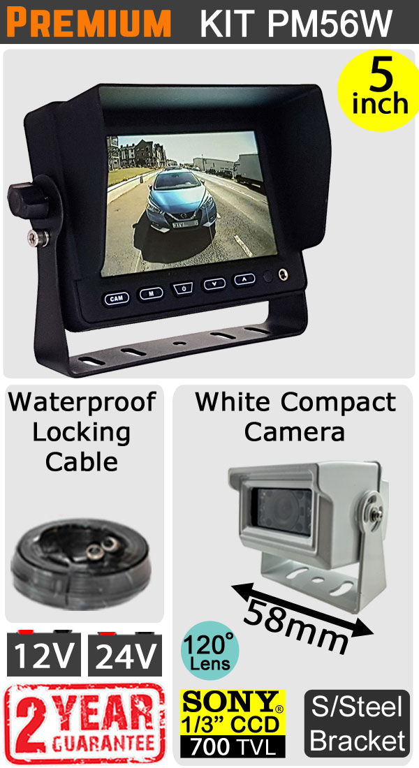 PM56W - Kit with 5" dash monitor + cable + Sony CCD compact white bracket reversing camera