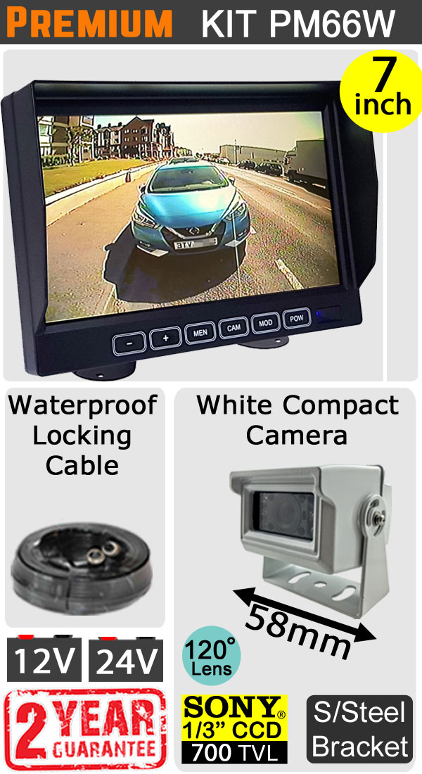 PM66W - Kit with 7" dash monitor + cable + Sony CCD compact white bracket reversing camera