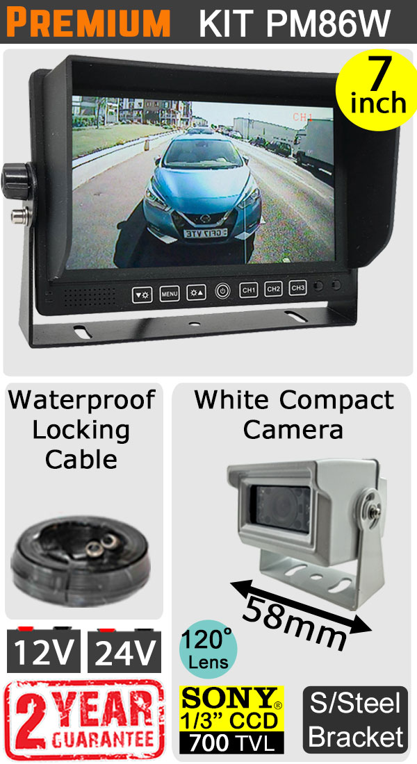 PM86W - Kit with 7" heavy-duty dash monitor + cable + Sony CCD compact white bracket reversing camera