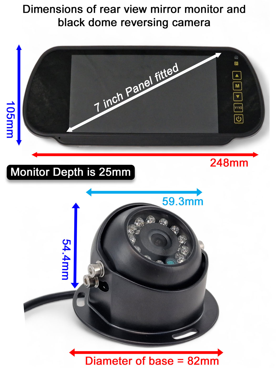 Our popular black dome reversing rear camera, coupled with our very high quality 7 inch rear view mirror monitor and Sony 1/3" CCD image sensor, giving a high resolution 700TVL image.
