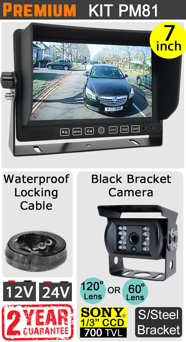 PM81 - Kit with 7" heavy-duty dash monitor + cable + black Sony CCD bracket reversing camera