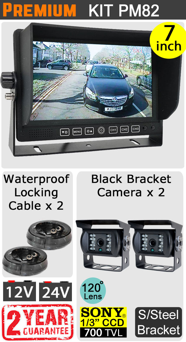 PM82 - Kit with 7" heavy-duty dash monitor + 2x cables + 2x black Sony CCD bracket reversing/general use camera