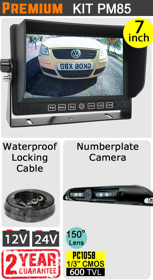 PM85 - Kit with 7" heavy-duty dash monitor + cable + hi-res numberplate reversing camera