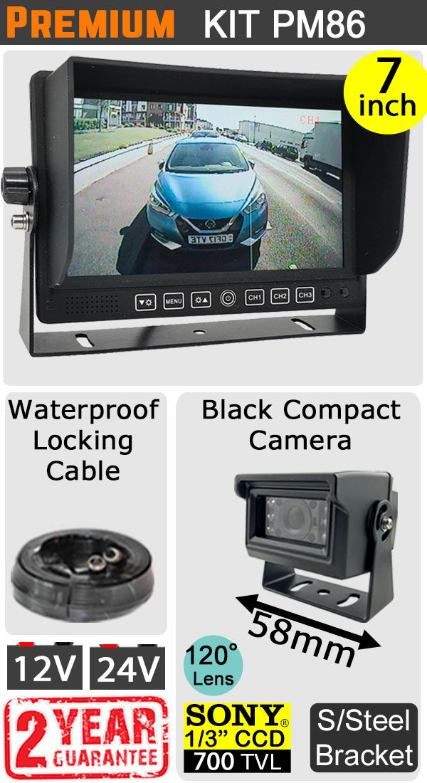PM86 - Kit with 7" heavy-duty dash monitor + cable + Sony CCD compact black bracket reversing camera