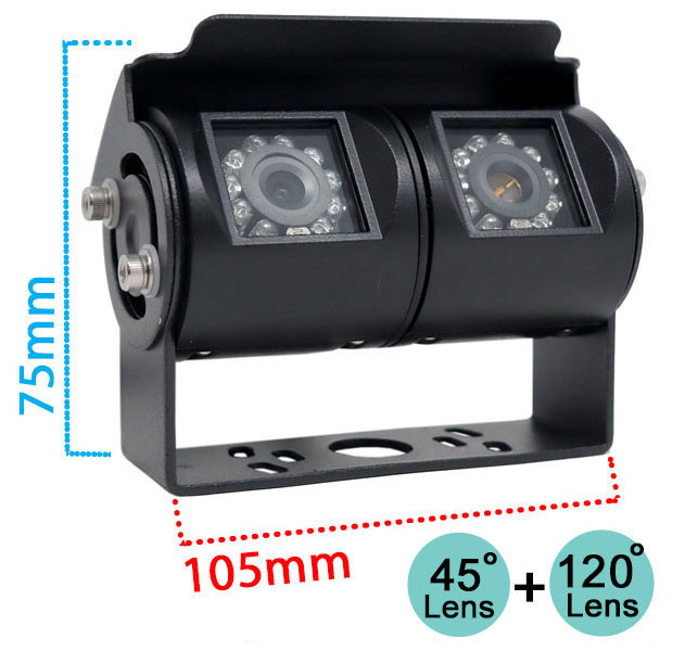 - Two cameras mounted in to one bracket. The camera you will adjust to face down is fitted with a wide angle 120 degree lens - ideal for giving a good wide spread around the rear of the vehicle. The camera you will face backwards to watch traffic is fitted with a narrow angle 45 degree lens - ideal for seeing further backwards.