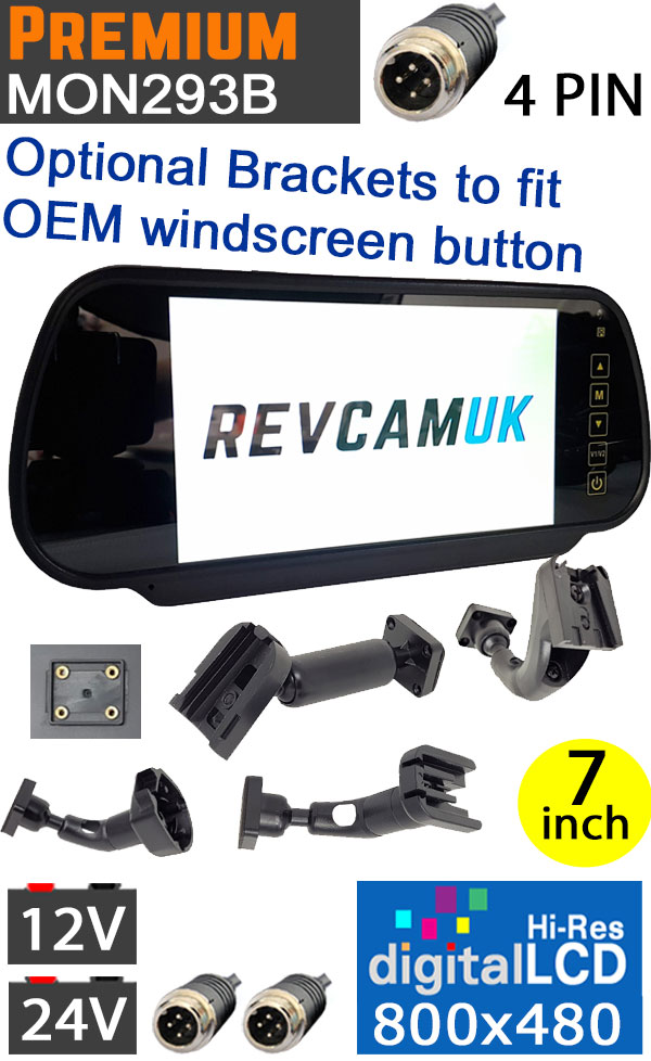 This rear view mirror monitor contains a 7 inch diagonally measured high resolution digital LCD panel. The rear of the monitor contains screw holes, which can fit various windscreen stalk brackets. Please see the main description below for details on the full list of brackets that can be selected using the drop down menu.