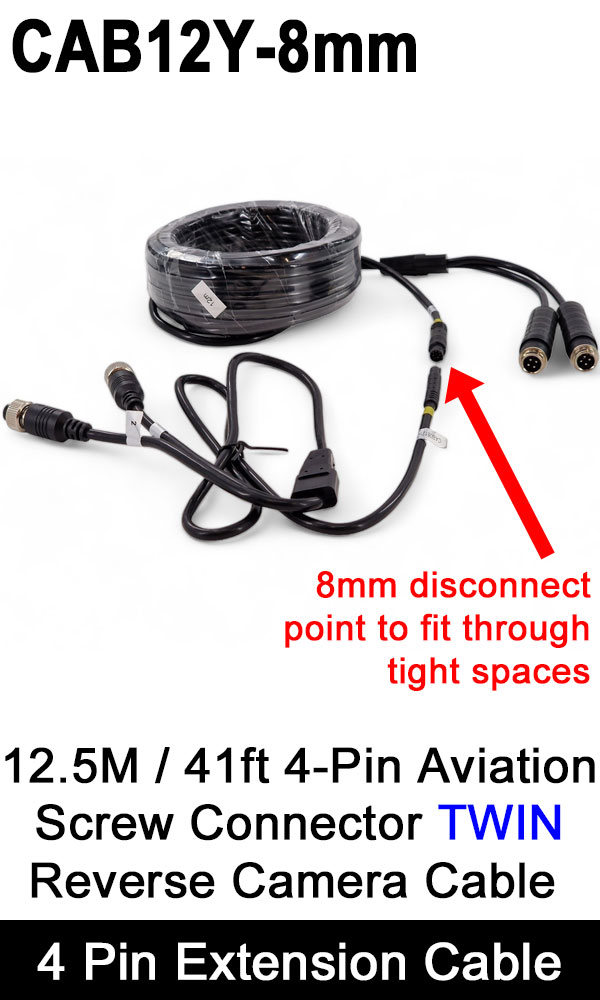 CAB12Y-8mm - Twin 4 Pin Extension Cable for two reversing / rear view cameras - 12.5M / 41FT with 8mm disconnect point for tight cable runs