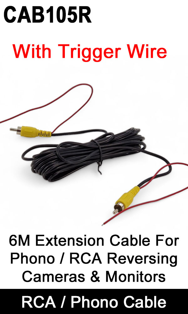 The phono / RCA cable is still used to link reversing cameras with screens, especially when it comes to linking to aftermarket sat nav radios. This is the 6M length, which is ideal for vehicles such as cars. The little red wire you see sticking out on both sides of the cable has been included to help people who need to run a trigger wire to their screen/radio.