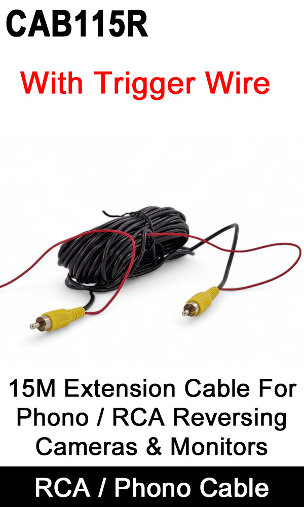 The phono / RCA cable is still used to link reversing cameras with screens, especially when it comes to linking to aftermarket sat nav radios. This is the 15M length, which is ideal for vehicles such as Motorhomes. The little red wire you see sticking out on both sides of the cable has been included to help people who need to run a trigger wire to their screen/radio.