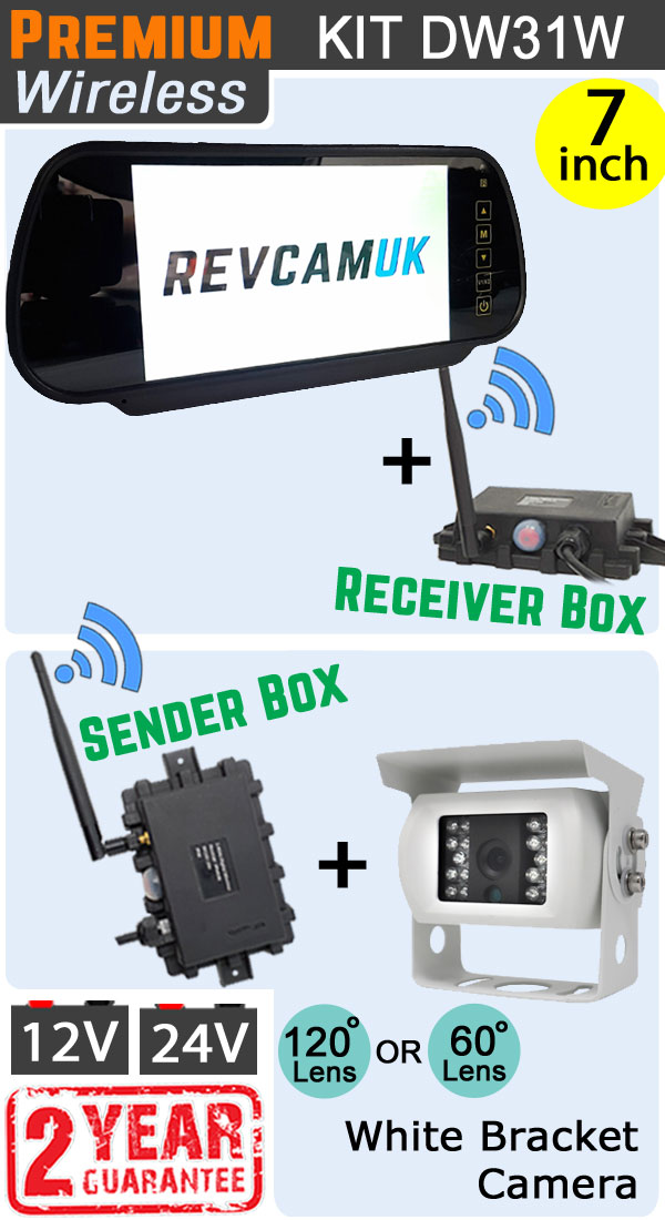 DW31W - Wireless kit with 7" mirror monitor + receiver box + white bracket camera + sender box
