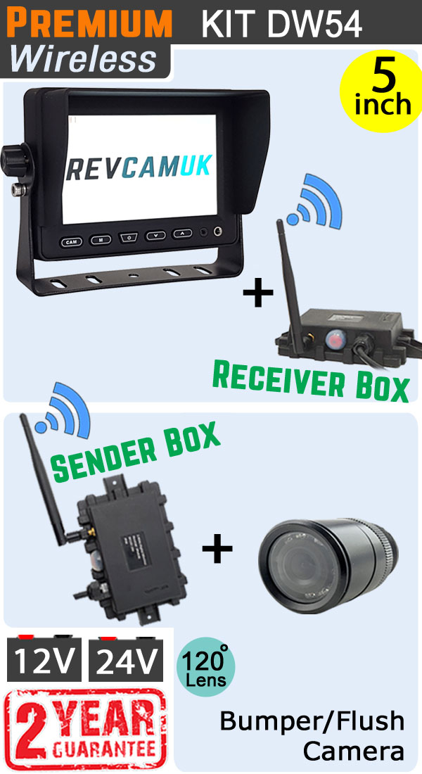 DW54 - Wireless kit with 5" dash monitor + receiver box + flush/bumper camera + sender box