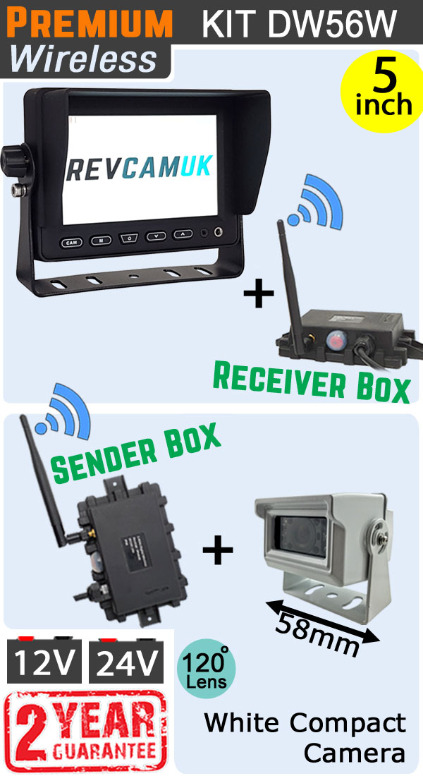 DW56W - Wireless kit with 5" dash monitor + receiver box + compact white bracket camera + sender box
